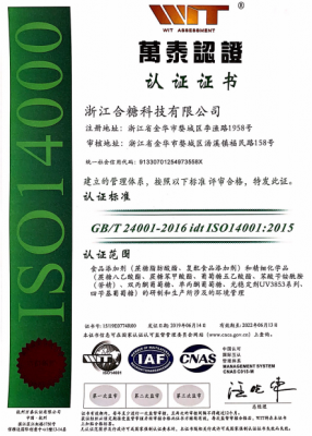 公司被評為“國家高新技術(shù)企業(yè)”,并有多個產(chǎn)品獲得“國內(nèi)發(fā)明專利”,通過了FSSC22000食品安全體系認(rèn)證,ISO14001環(huán)境管理體系,MUI HALAL認(rèn)證,SKS KOSHER認(rèn)證,ISO9001質(zhì)量管理體系和ISO22000食品安全管理體系認(rèn)證,并有多個產(chǎn)品通過了“歐洲REACH法規(guī)”注冊和“韓國REACH法規(guī)” 預(yù)注冊。